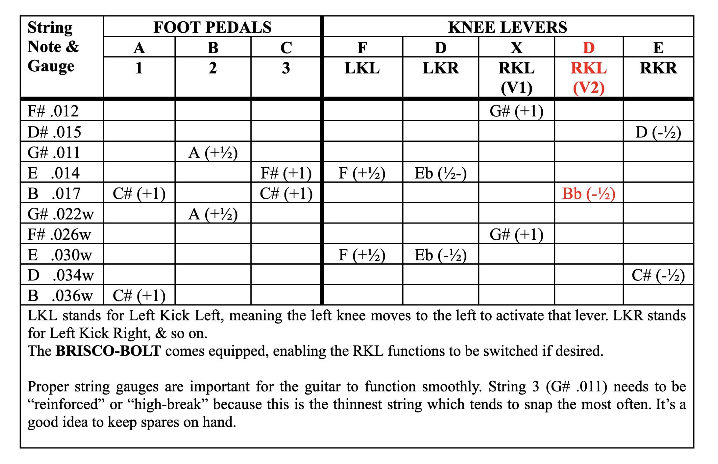 The Brisco Bolt is set up with the string gauges listed in the Tuning Chart. When replacing strings, BE SURE to use strings whose gauges & type match the list below. A deviation from these may require a slight adjustment of the nylon tuning nuts; or it might require relocation of a pull bar in the 5-hole pull finger to properly tune the different strings. Be sure to use WOUND strings where indicated below (by a “W”).